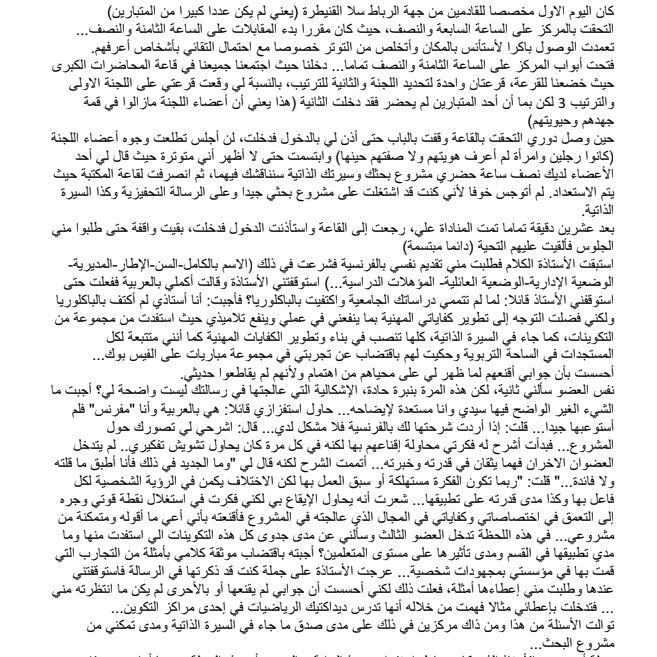 لكن أستاذة العربية نبهتني إلى كون موضوع بحثي يتسم بالجدة وبأنه سيكون من الأمور التي سيتم تبئير الاشتغال عليها في المركز في حالة نجاحي، خصوصا وأنه موضوع ذو راهنية كونه يرتبط بالممارسة المهنية التي تشكل إحدى اهتمامات وأولويات الرؤية الاستراتيجية.