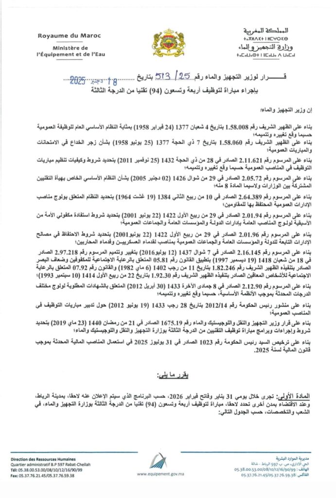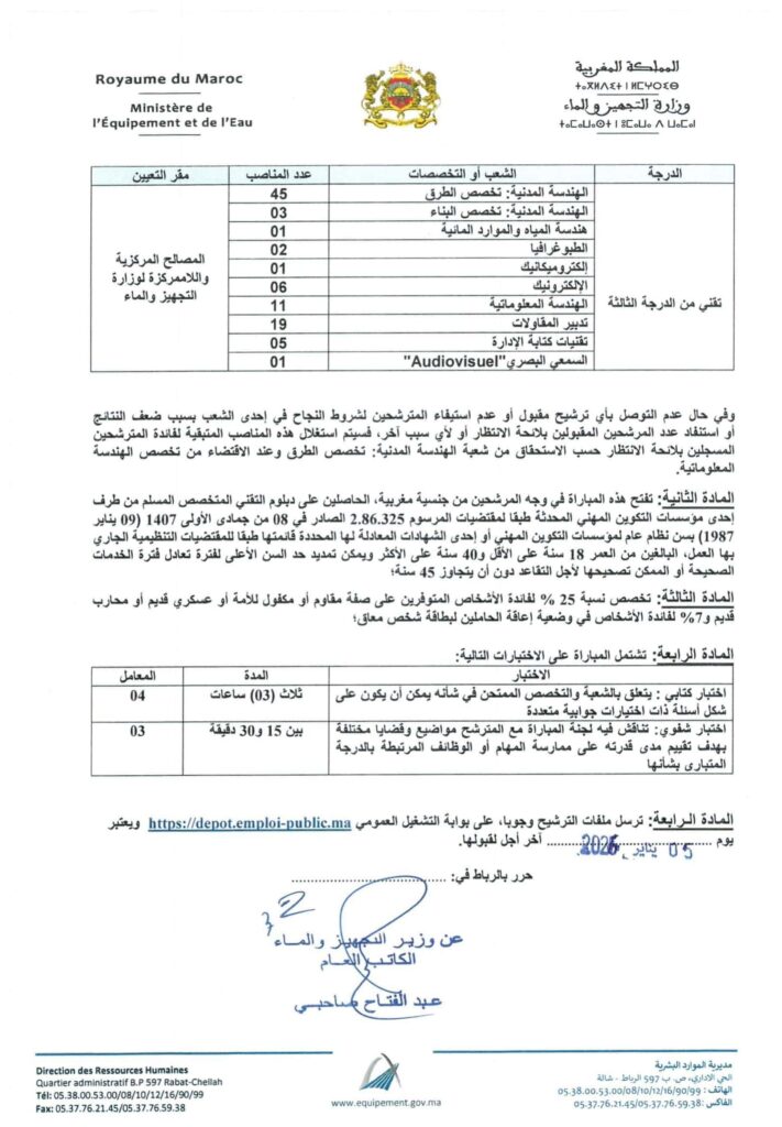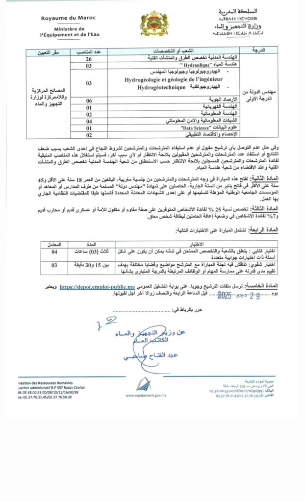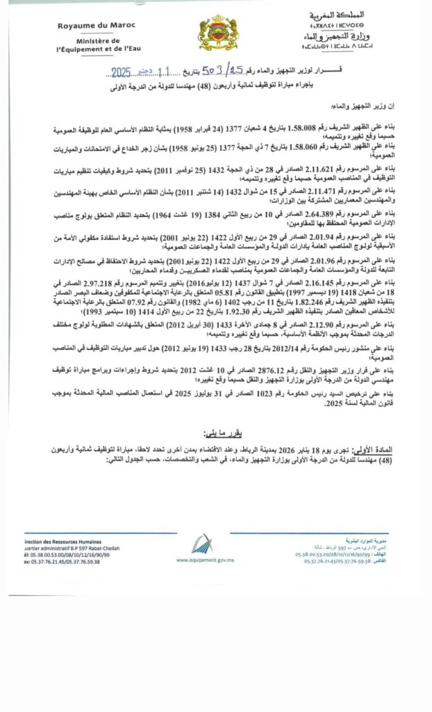 مباراة توظيف (142) منصب بوزارة التجهيز والماء، آخر أجل لإيداع الترشيحات 29 دجنبر و 5 يناير 2026