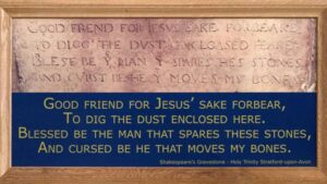 Cet avertissement a probablement été écrit par Shakespeare lui-même. À son époque, les corps n’étaient exhumés qu’à des fins de recherche ou même simplement pour faire de la place pour de multiples sépultures, et Bard ne voulait pas qu’il en aille de même pour ses restes. Jusqu’à présent, son avertissement semble fonctionner. Bien que la tombe ait été réparée en 2008, les ouvriers ont affirmé que les pierres ne seraient jamais déplacées et que les os ne seraient jamais brisés.